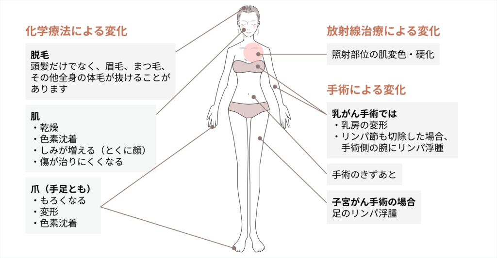 がんの治療によって生じる外見の変化には、薬物療法や放射線治療による脱毛、皮膚の変化、手術によってできる創傷などがあります。