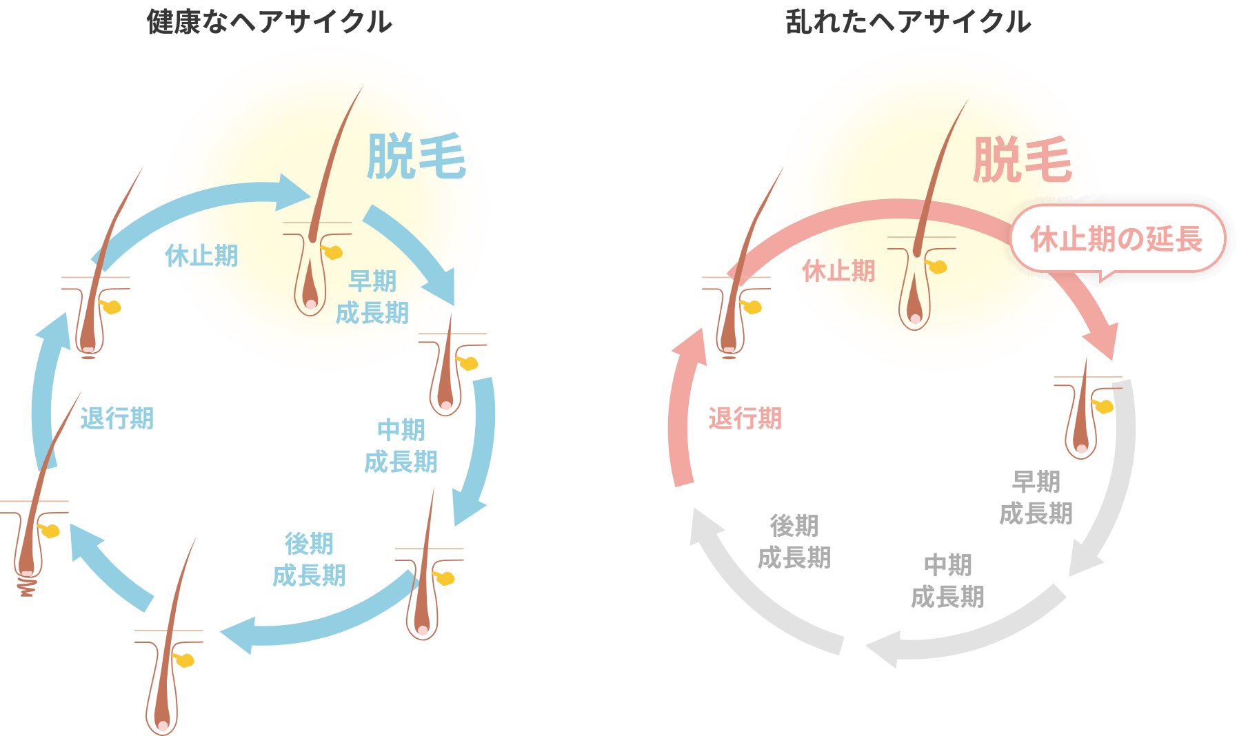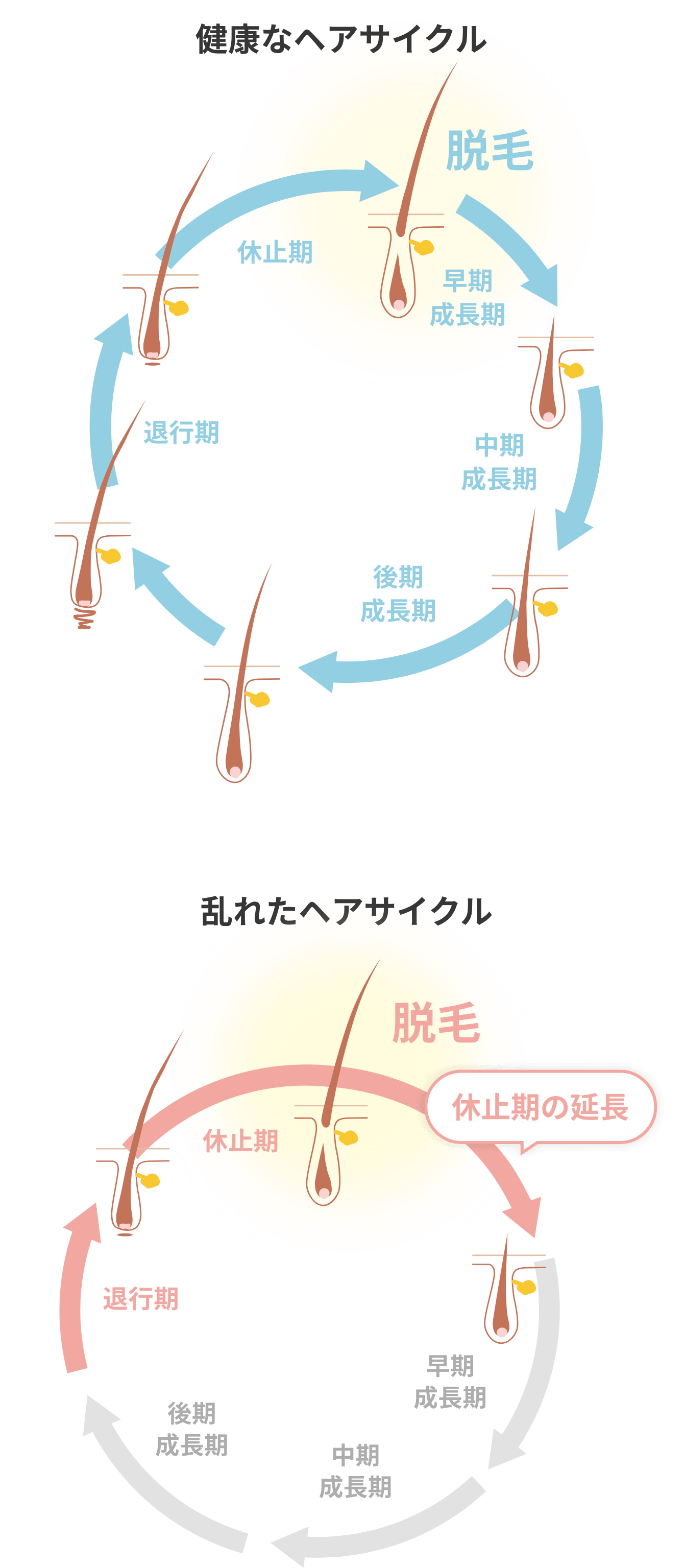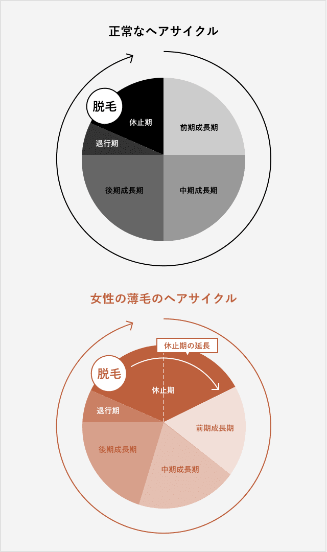 髪は一定のサイクルで成長しています。成長期(新しい髪が成長する期間)→退行期(成長が弱まる期間)→休止期(完全に成長が止まり髪が抜けてしまう)というサイクルが、通常2~7年で繰り返されています。 薄毛・抜け毛の多くは、このヘアサイクルが何らかの原因で短縮され、毛髪が完全に成長する前に抜け落ちることで起こります。