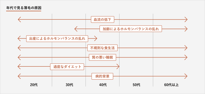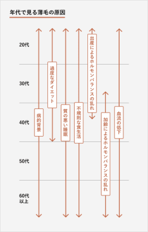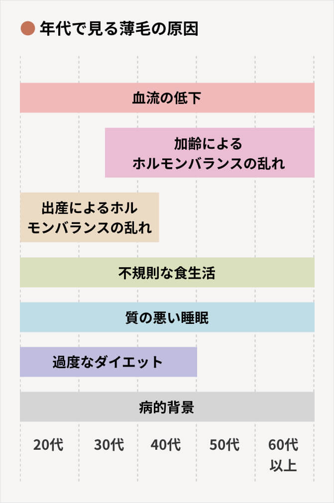 若い人で起こる薄毛の原因として、ホルモンバランスの乱れに繋がる手術・ストレス・過度なダイエットなどが挙げられます。 女性ホルモンの分泌量が低下すると髪の成長が止まる休止期の期間が長くなり、最高7か月間毛髪の成長がストップするケースもあります。