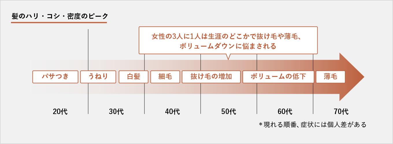 また、女性ホルモンの分泌量は20代後半にピークを迎え、30代になると横ばいか減少していきます。髪にうねりが出やすく、指通りも悪くなるなど髪質も変わってくる時期です。また、30代で出産を経験する方が多く、産後抜け毛が起こる方も多くいらっしゃいます。産後や卒乳・断乳後に女性ホルモンの分泌量は急激に低下するため、そのタイミングで薄毛症状を発症する方が多いです。