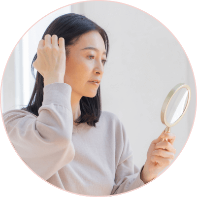 40代になると女性ホルモンの分泌量は急激に減少し更年期を迎えます。女性ホルモンはハリ・コシのある美しい髪を育むため、分泌量が減少することで髪質は悪くなり、白髪や薄毛が目立つようになります。