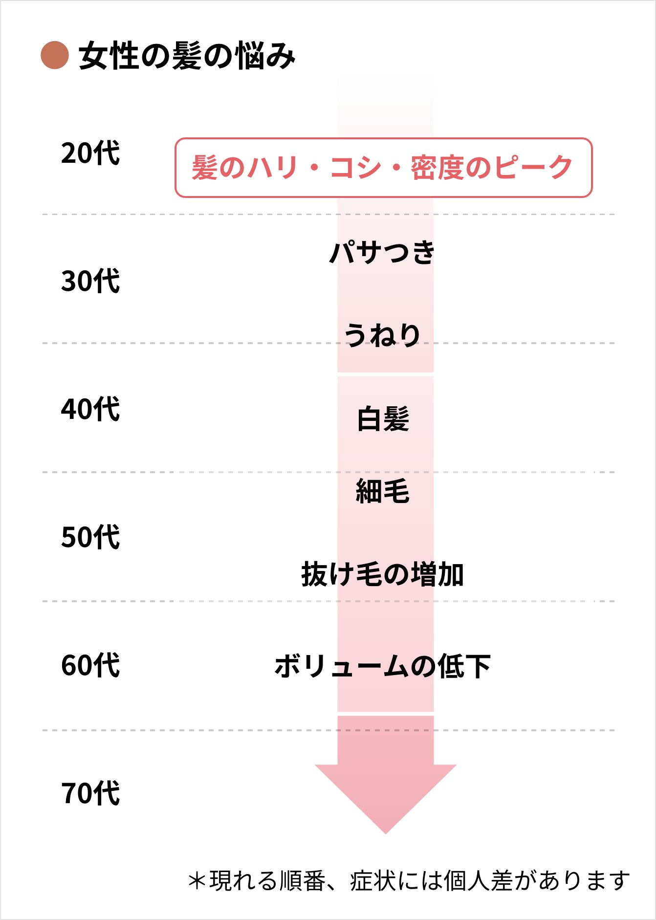 60代に入ると女性ホルモンの分泌量は低水準で安定していきます。女性ホルモンは加齢によって40代から減少するため、薄毛症状もより現れやすい状態となります。 なお、この時期には白髪のお悩みも出てきますので、カラーリングなどで頭皮に負担をかけても大丈夫か?などのご相談も併せて受けることが多いです。