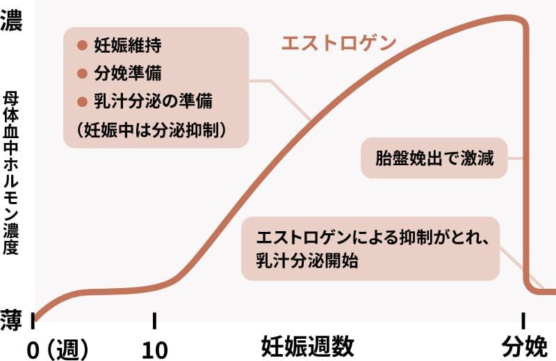 産後抜け毛の最大の要因は、女性ホルモンの一種である「エストロゲン」の分泌量の大幅な変化です。妊娠中はエストロゲンの分泌が徐々に増え、出産すると急激に減少します。この大きな変化に身体や精神が追いつかず、産後すぐの女性の心身には様々な不調が生じることで、抜け毛が引き起こされます。