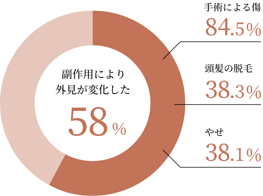 国立がん研究センターの統計によると、2019年のがん罹患者数は全国で101万7200人と予測されており、その大半の人が何らかの治療を受けたと考えられる。一方、約1000人のがん患者を対象とした厚生労働省研究班の調査(18年発表)では、がん治療で外見が変化したと感じた人は全体の58パーセントを占めた。そのうち最も多かったのは「手術による傷」(84.5パーセント)で、次いで「頭髪の脱毛」(38.3パーセント)、「やせ」(38.1パーセント)が続いた。※複数回答あり