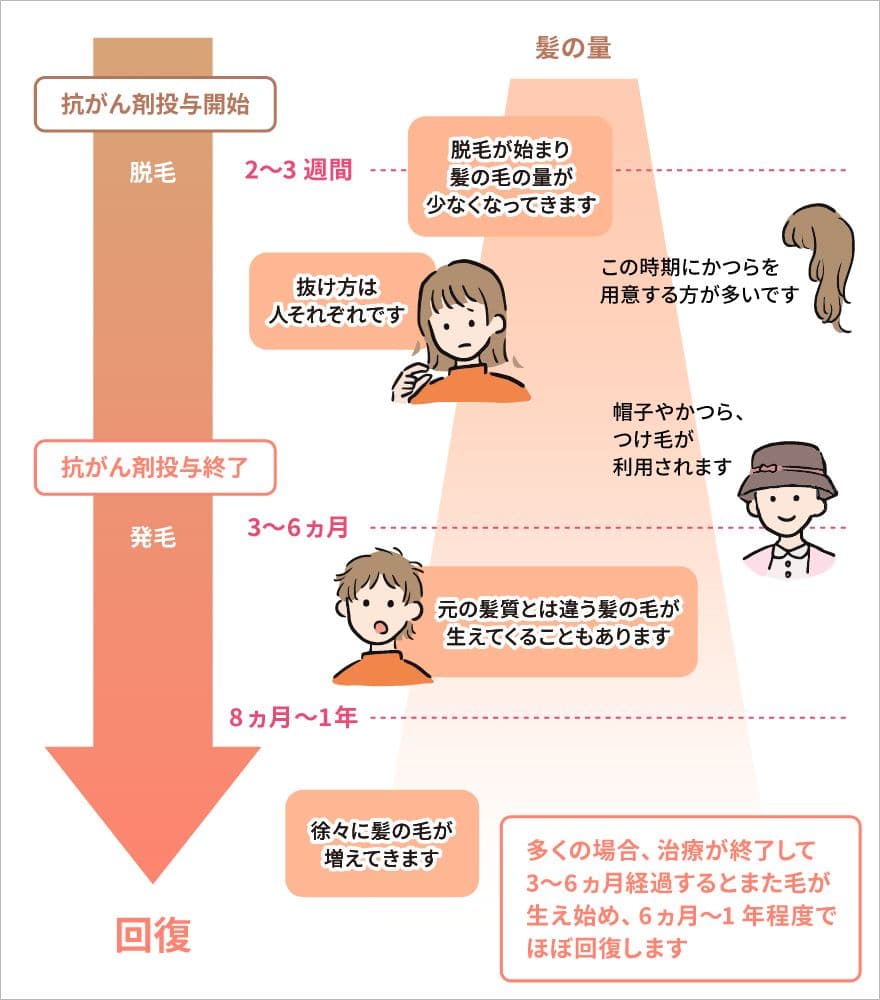 一般的に、抗がん剤投与後2〜3週間後で脱毛がはじまることが多いといわれています。脱毛の程度は人それぞれですが、たいていの人は治療が終わると1~2ヶ月で再生がはじまり、3~6ヶ月(早い人では2~4ヵ月)経過すると、ほとんど回復します。