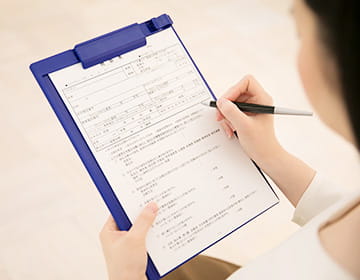 問診表を記入していただいたあと、スタッフが身体の状態を伺い、費用などについて説明します。